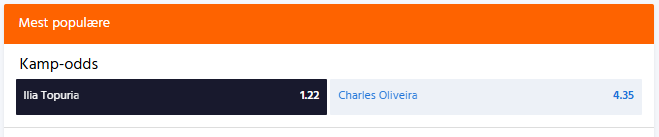 Expekt har nemlig Ilia Topuria som kæmpefavorit i kampen. En sejr til den spanske matador giver således bare pengene 1,22 gange igen. Skulle Oliviera efter weekendens kamp igen kunne kalde sig champ, så står en sejr til brasilianeren til odds 4,35.