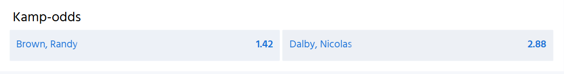 Napper Nicolas Dalby også en sejr i kampen mod Randy Brown, så giver det odds 2,88 hos Expekt. Randy Brown giver omvendt blot odds 1,42, hvilket omregnet til procenter betyder, at bookmakeren giver Brown ca. 70 procents chance for at vinde kampen, mens Dalby spås ca. 30 procents chance.