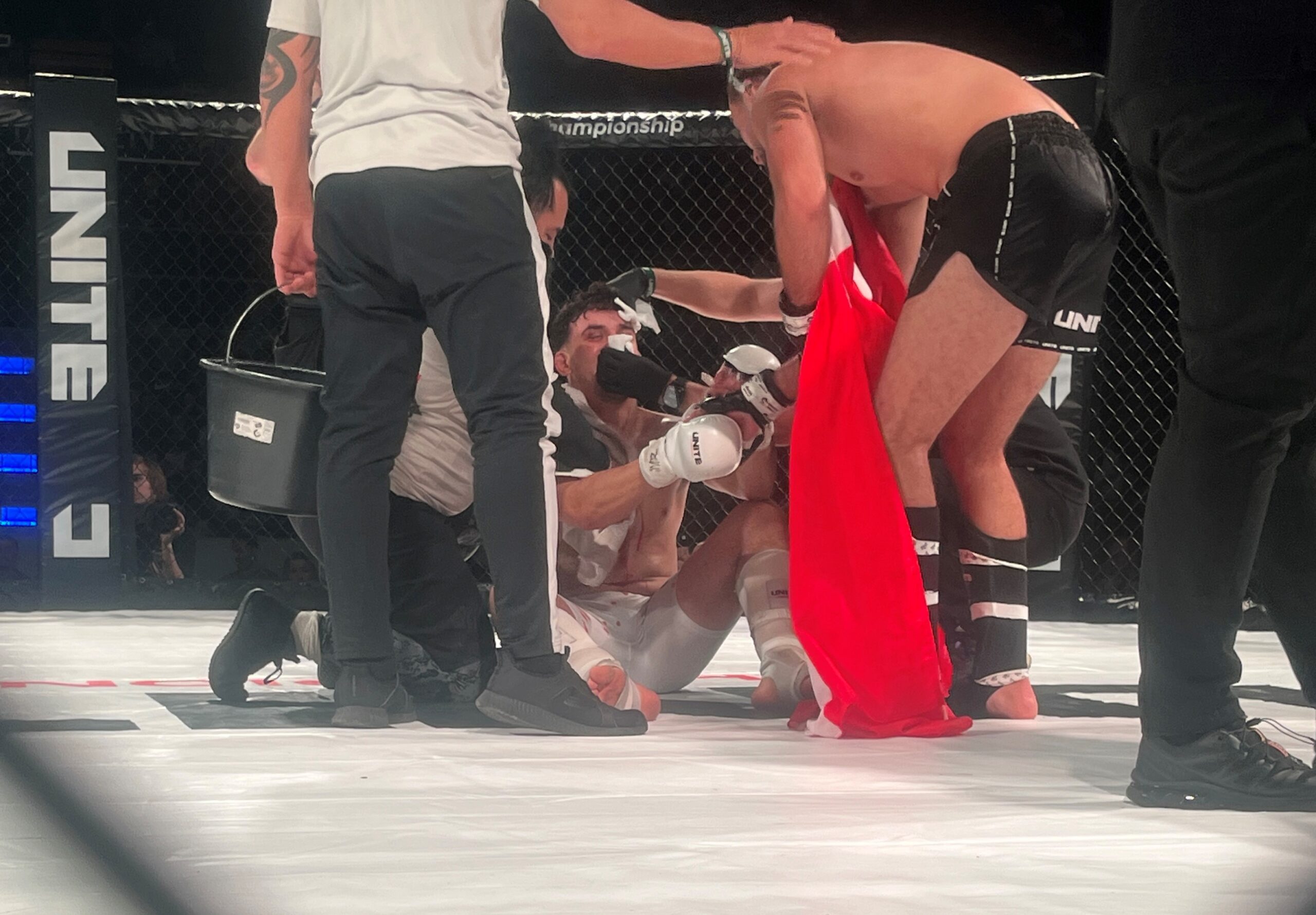 Den danske MMA-kæmper med de albanske rødder var dog allerede kort efter ovre for at se til den noget omtågede Benjamin Solevad, der lige var nogle minutter om for alvor at komme på benene.